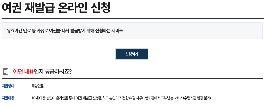 온라인 재발급은 '기존에 발급받은 여권'을 소지한 만 18세 이상 성인에게만 해당됩니다.